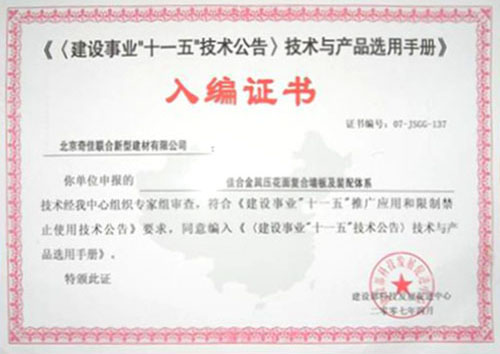 - 2007年被選入《建設業(yè)“十一五” 技術公告技術與產品選用手冊》